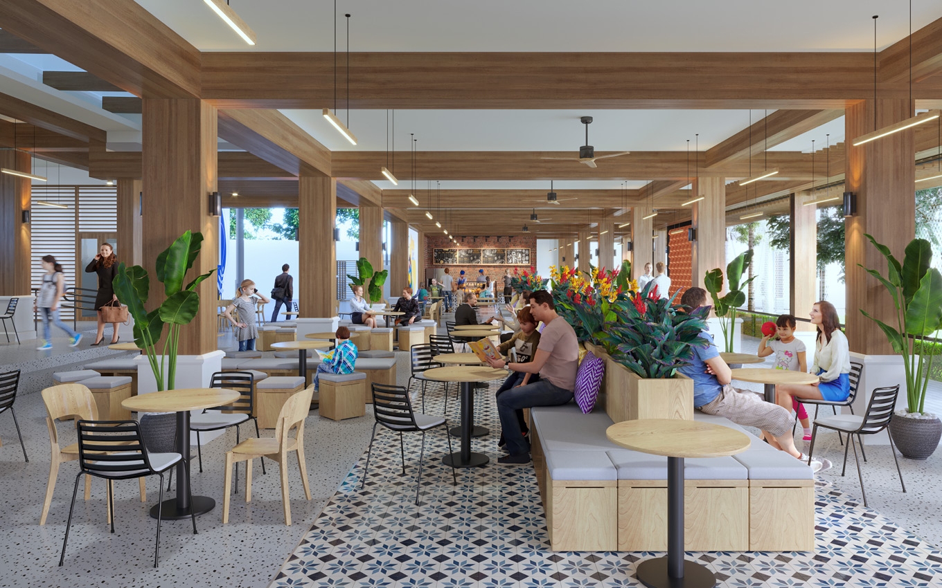 timber structures frame the space, whilst patterned tiles create a relaxed